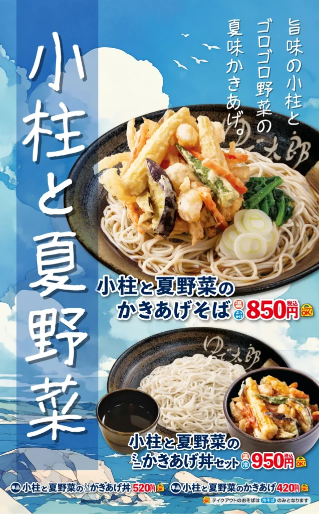 ゆで太郎システムでは1〜2ヶ月ごとに季節のかき揚げが提供されます。今回は小柱と夏野菜(ヤングコーン、ナス、アスパラ、ニンジンかな?)。個人的にはヤングコーンが良きです。